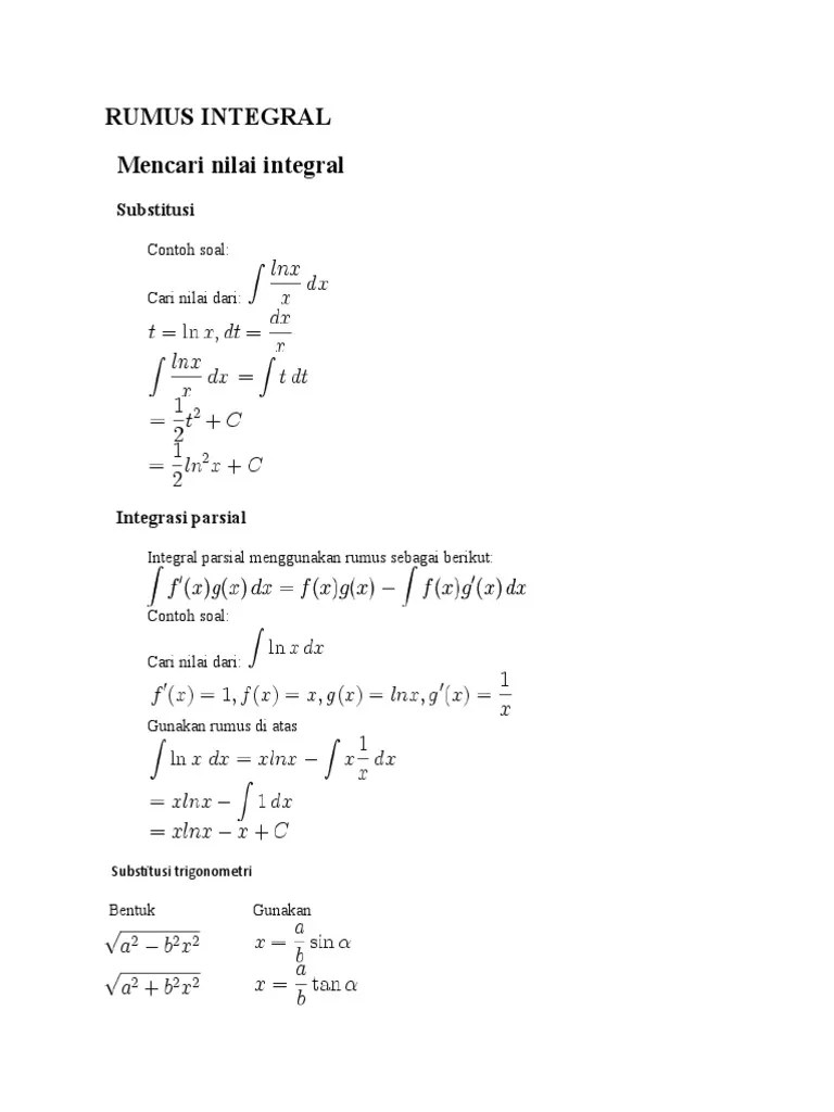 Berikut adalah materi tentang integral substitusi dan integral parsial beserta contoh soal lengkap dengan pembahasannya secara rinci. Untuk contoh soal pertama ini kita akan coba bahas dengan dua cara yaitu dengan rumus integral parsial dan dengan tabel. Eksponen integral parsial pecahan integral parsial tabel integral. Secara umum, rumus integral persial di nyatakan melalui persamaan seperti yang di bawah ini : Rumus integral parsial digunakan untuk soal integral yang sangat kompleks. Dalam pengintegralan parsial menggunakan tabel ini memakai tiga aturan . Rumus integral parsial dan contoh soalnya beserta pembahasannya. Pembahasan misalkan u = x2 dan dv = v' dx = sin 4x dx. Berikut ini tabel turunan yang mungkin dapat dijadikan sebagai acuan untuk mengerjakan soal integral parsial. Hasilnya dapat terlihat sepeti tabel di bawah. Dan hasilnya dapat kita lihat bersama sepeti tabel di bawah ini :. Integral substitusi integral parsial materi rumus contoh soal from . Untuk mengintegralkan fungsi tersebut kita memakai rumus integral parsial,.